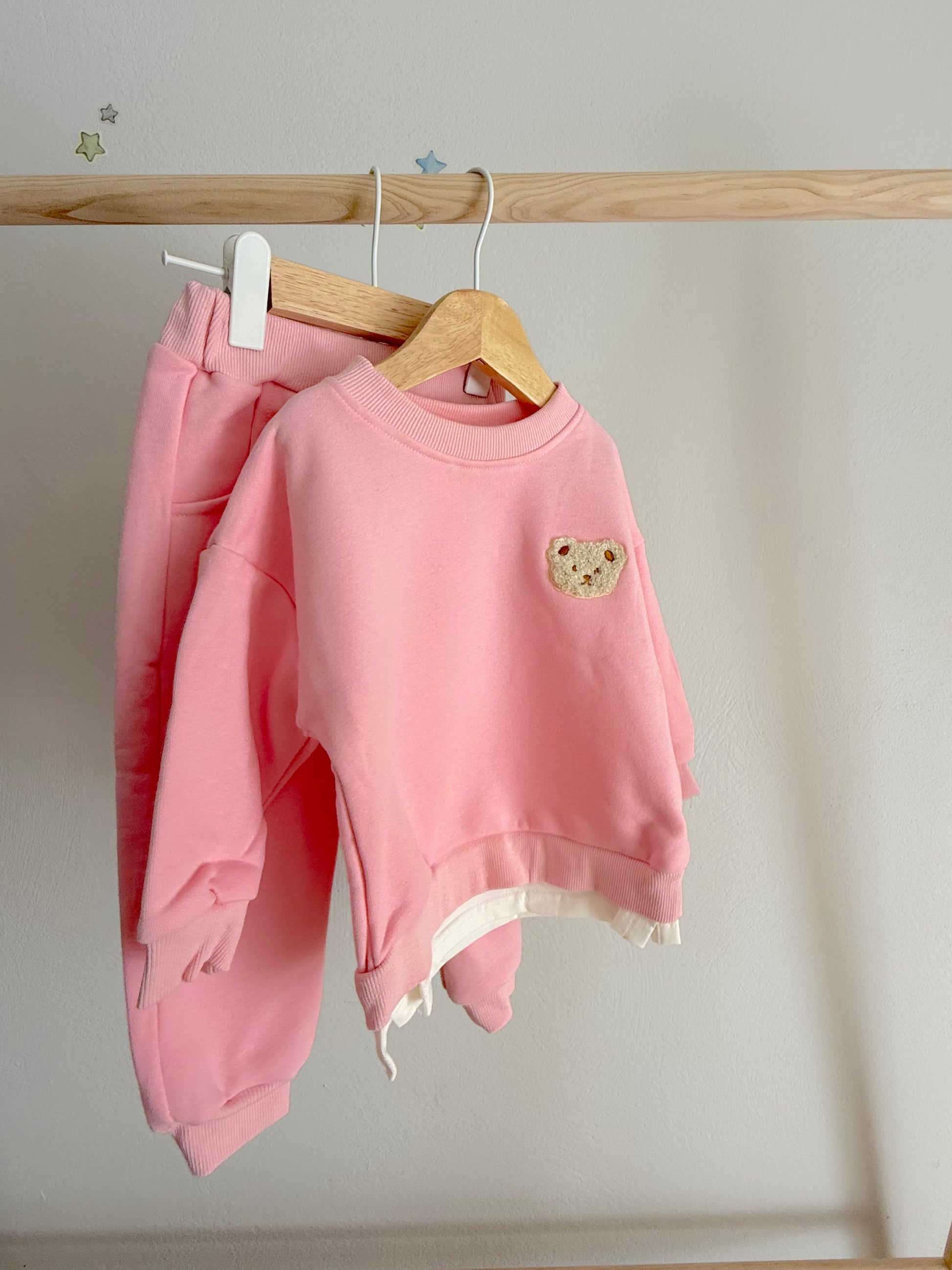 Το σετ φόρμας Bear Hugs, σε απαλό μέντα,λιλά ή ροζ, φτιαγμένο από χοντρό ύφασμα με τύπωμα αρκουδάκι είναι το ιδανικό για άνεση και ζεστασιά.