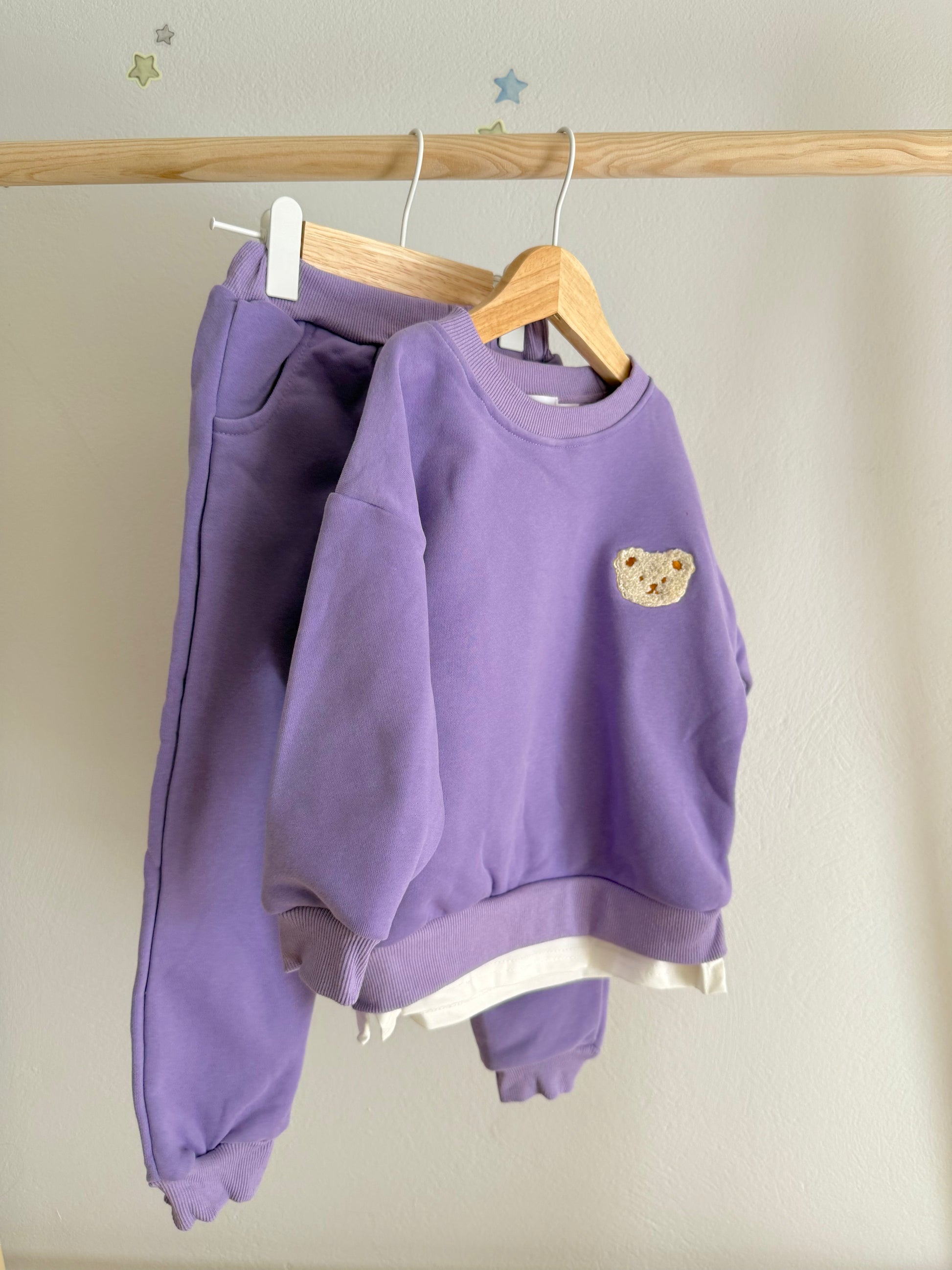 Το σετ φόρμας Bear Hugs, σε απαλό μέντα, λιλά ή ροζ, φτιαγμένο από χοντρό ύφασμα με τύπωμα αρκουδάκι είναι το ιδανικό για άνεση και ζεστασιά.