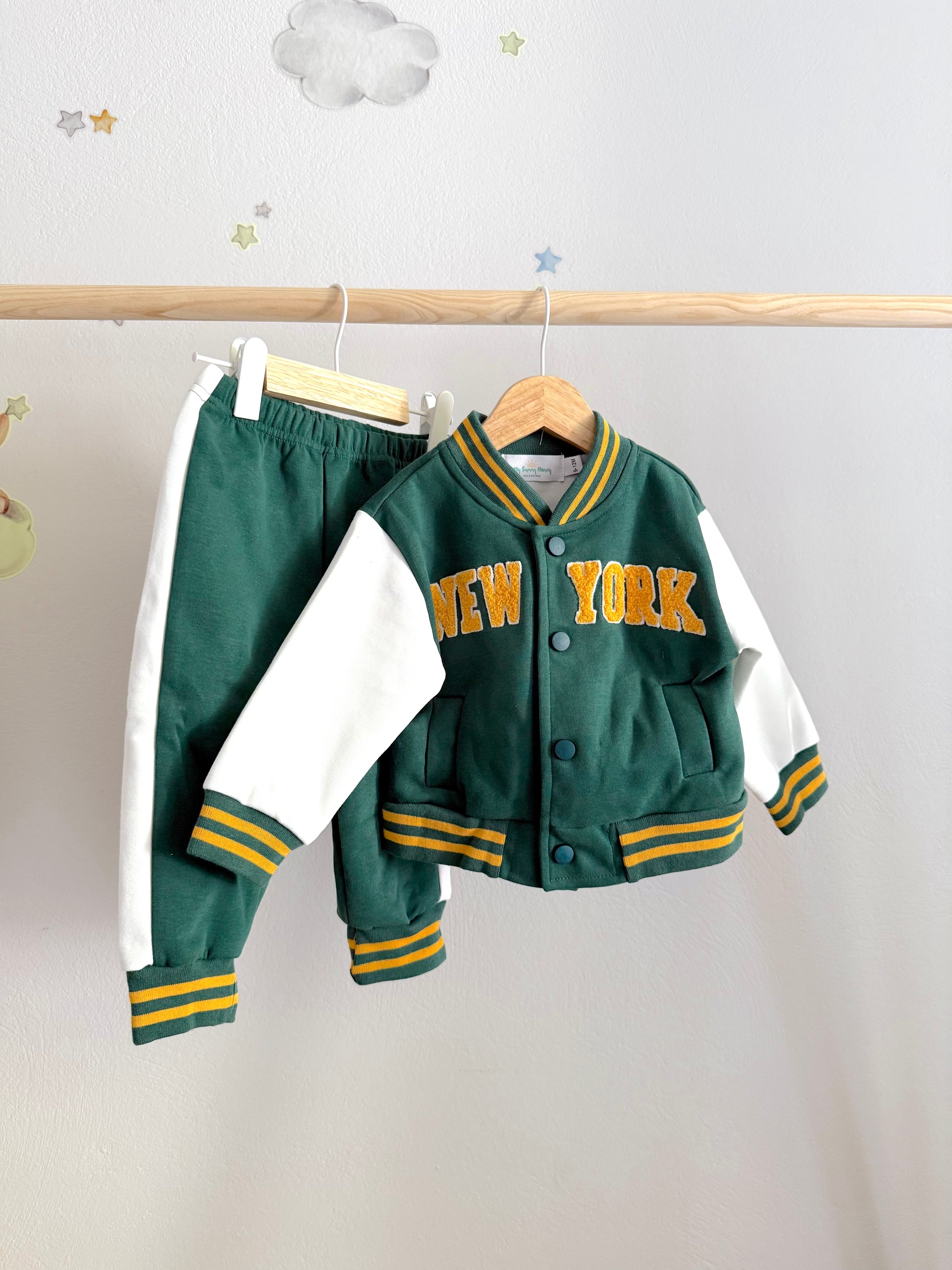 Το σετ φόρμας Little Explorer, σε ροζ και πράσινο, περιλαμβάνει φουτερένιο τζάκετ με κουμπιά και τύπωμα New York. Άνετο και μοντέρνο, είναι ιδανικό για τους μικρούς εξερευνητές που θέλουν στυλ και ζεστασιά σε κάθε περιπέτεια!