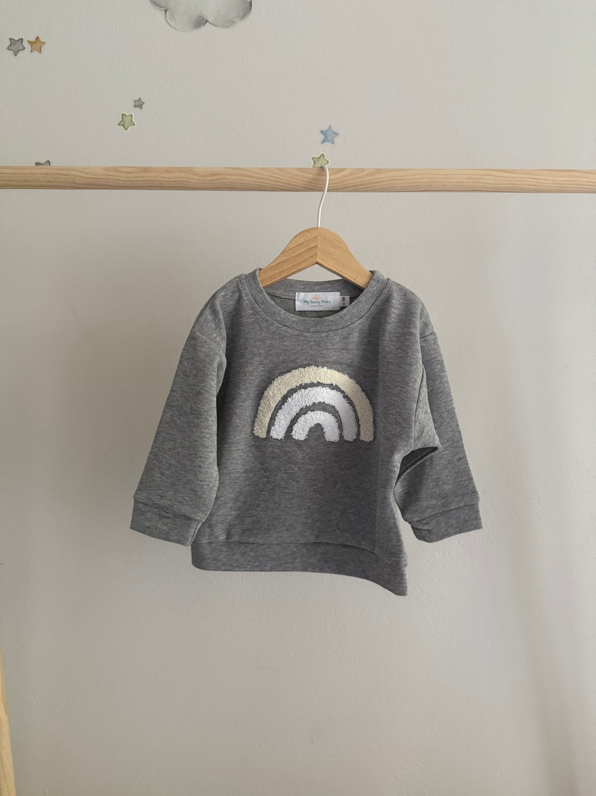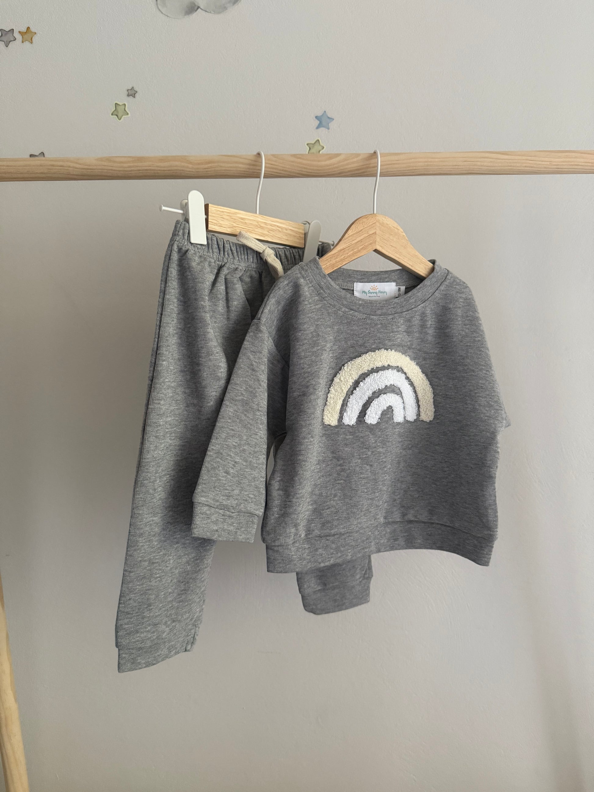 Το πιο χαριτωμένο και άνετο σετ φόρμας! Σε κλασικό γκρι χρώμα, με λευκό ουράνιο τόξο στο κέντρο, δίνει μια παιχνιδιάρικη νότα στην καθημερινή τους γκαρνταρόμπα. Φτιαγμένο από μαλακό ύφασμα, είναι ιδανικό για παιχνίδι, χαλάρωση και τις πρώτες μέρες στο σχολείο. Άνετο, πρακτικό και ζεστό, το σετ αυτό θα γίνει το αγαπημένο τους!